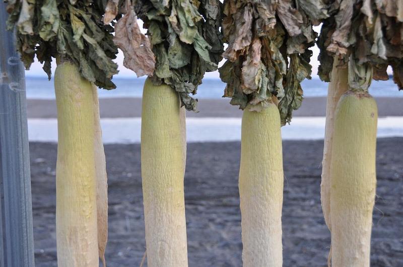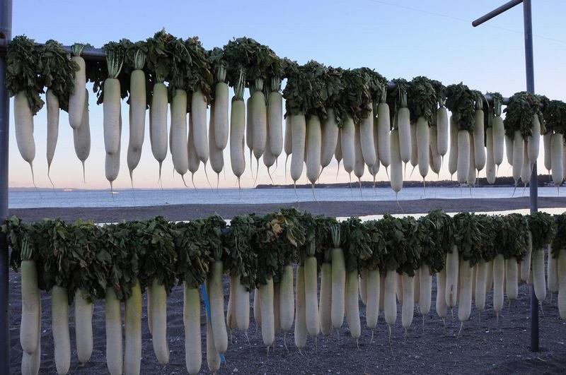 三浦海岸の砂浜は広いので、建築用材のポールを使用して、二段の掛け棚を作り、小型トラックが通れる間隔で、畑から運んで来ては干し、昼夜の寒干しですっかり水分が飛んで萎びた大根になると、首元からスパッと切りとり収穫して行く。大根のカーテン越しに、東京湾の対岸には房総半島がくっきりと見え、青い空と海に大根の緑と白さが、冬の澄み切った風景を一層引き立てている。