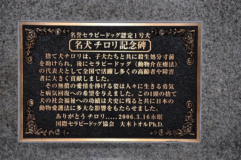 案内板には、「捨て犬チロリは、子犬たちと共に殺生処分寸前を助けられ、後にセラピードッグの代表犬として全国で活躍し多くの高齢者や障害者に大きく貢献した」など記載されている。