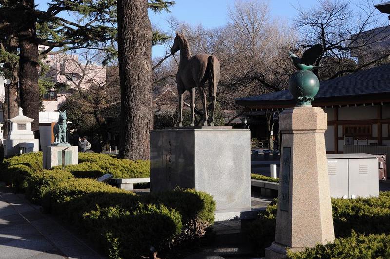 靖国神社の遊就館前広場には、シェパード犬、馬、鳩を象った銅像が並んでいる。