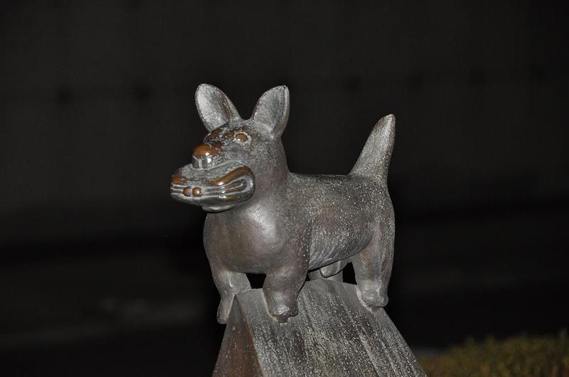 銘板には、「財布をくわえた犬(どうしようかな?)」 藤原吉志子作 寄贈 横浜中ユース会議と記されている。藤原吉志子さんは、1942年