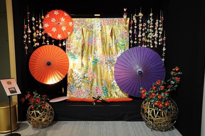 下の二枚目の写真は、「ホテル雅叙園東京の婚礼用着物」と調度品を展示しており、来館記念に撮影を促していた。 |
