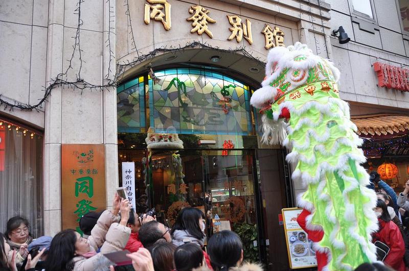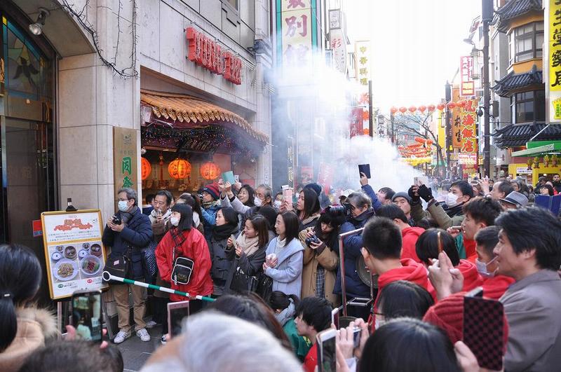 獅子舞がお店の前に着くと、一回目の爆竹が鳴る。