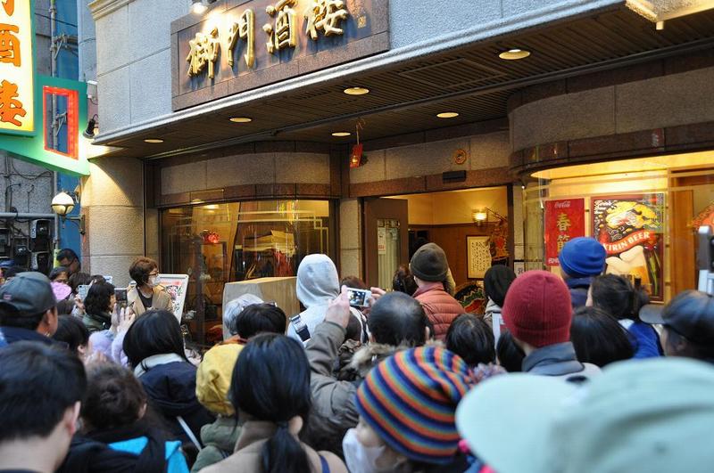 遠目に見ても、獅子頭が2つ見えたので、急いで駆けつけると、「獅門酒楼」の前で、2つの獅子頭が踊ったり、お店の中に出入りしていた。先ほどまで追っ駆けていた獅子舞(5頭の獅子頭)と、まったく色合いも異なり古さも貫禄もある。