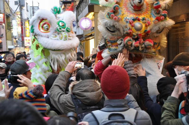 「中山路」の中ほどで人だかりが出来、獅子舞の支援隊の音色が鳴り響いていた。