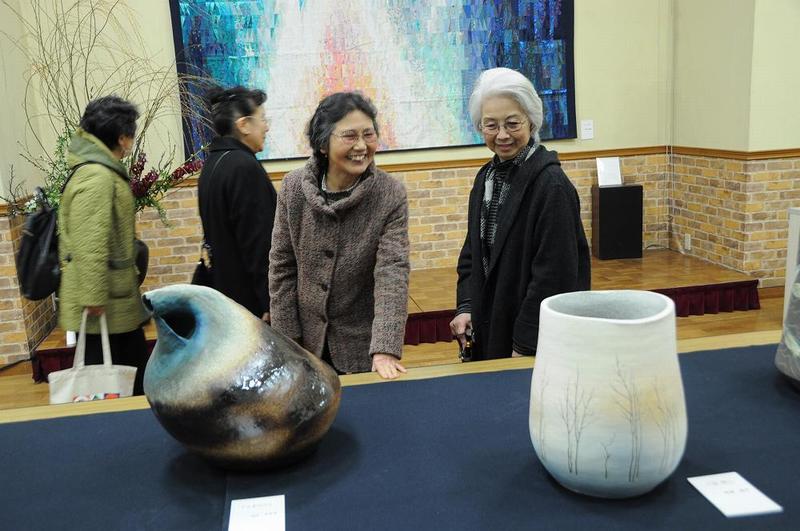 座間神社(山本俊昭宮司)の夫人で、ご自身も作品を出展しており、各界(生け花、手芸、版画や絵画、陶芸、ガラス細工、パッチワーク)に呼びかけを行ない、約百人による力作が集まり、館内や庭園に展示されていた。中でも2組について特記したい。