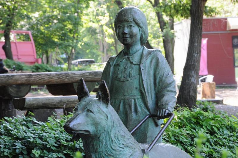 像の台座の正面下部のプレートに、「少女と盲導犬」、「グリーンウェーブ相模原'92」とあって、1992年のイベントで設置されたようだ。 公園内には動物などの銅像が幾つかあるのだが、詳しい由来は不明です。