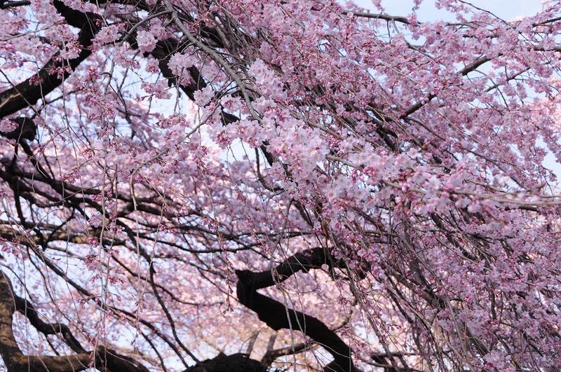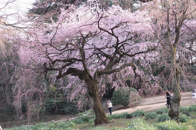 「日本庭園の下の池」そばに、見頃のシダレザクラが有った。