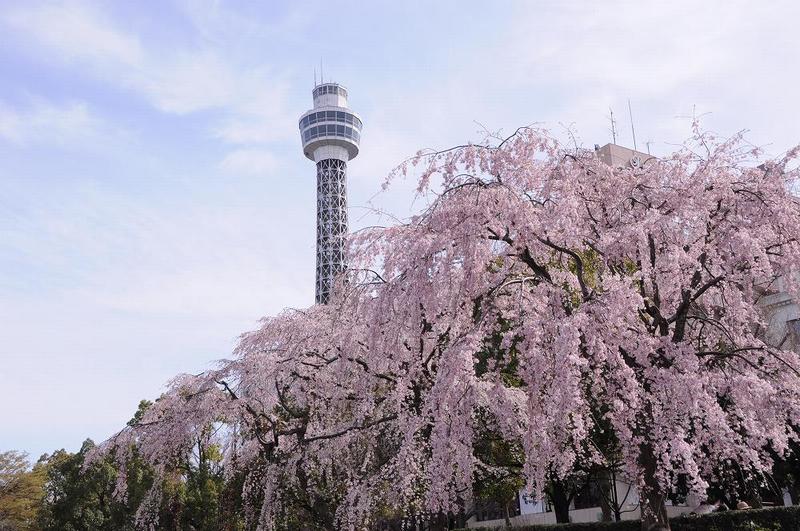 横浜マリンタワーとシダレザクラのコラボも絵になる。