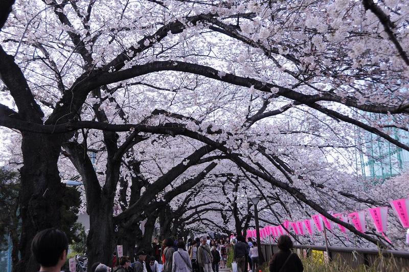 上流の中目黒あたりまでは、川幅も広く、桜並木と川の中央に見える高層ビルとのコラボが絵になる。