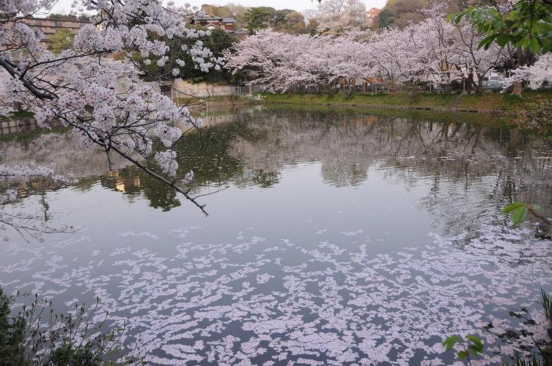5〜6日経つと花びらが茶色く変色するので、池の端の高齢者が大きな網で汚い花びらを取り去っていた。