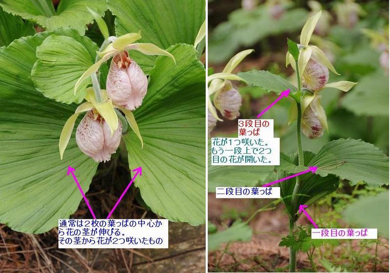 今回の特ダネは、扇型の葉っぱが片側一枚ずつで3階建てになり、そして上下2段で2輪の花が咲いていた。 |