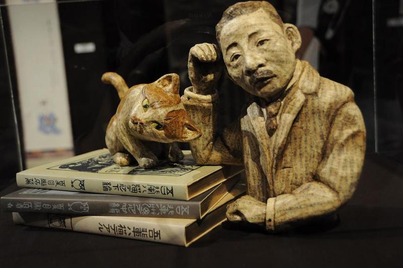 廃棄される文庫本から著者のオブジェを制作する古本選堂の「文豪と猫」張り子シリーズを展示していた。