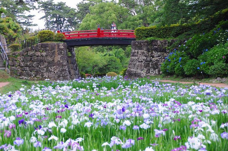 小田原城址公園の本丸東掘でも、例年より10日ほど早く開花した花菖蒲が見頃を迎えていた。