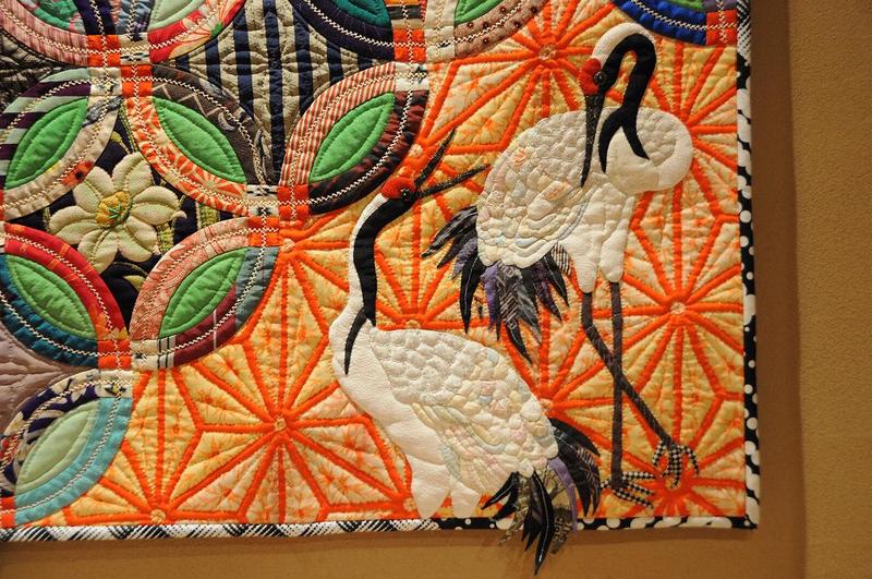 大きな和キルトの中には、富士山有り、童の顔有り、勝虫のトンボ、四季の草花有り、動物に犬と兎(2人の干支かも)、そして、お目出度を表わす代表と言えば、「鶴」,「亀」,「鯛」,「麻の葉紋(朱色の六角形)」を見つけたので、それぞれの部分を拡大撮影しています。