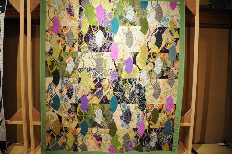 2メートル四方の布地にパッチワークするという「スケールの大きな作品」が展示されている。 中でもチョット地味な配色ではあるが、《息吹》という作品は、濃淡ある背景の上に様々な扇子型のパッチワークで立涌文様を描いたこの作品は、無数の色と和柄が違和感ない一体感を作り出している。