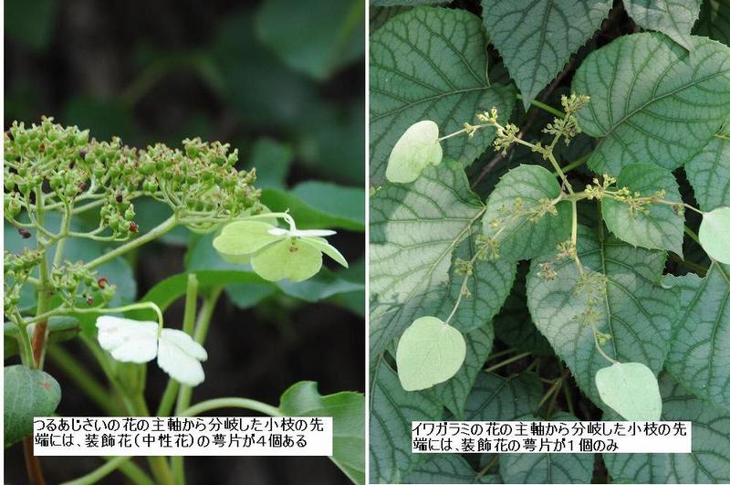 豊島園で葉っぱの色違いを見つけたものの、イワガラミには2種類の葉っぱがあった。ところで、「相模原麻溝公園」のツルアジサイは、樹高20メートルほどの大木に巻き付いているもので、15メートルほど伸びている。