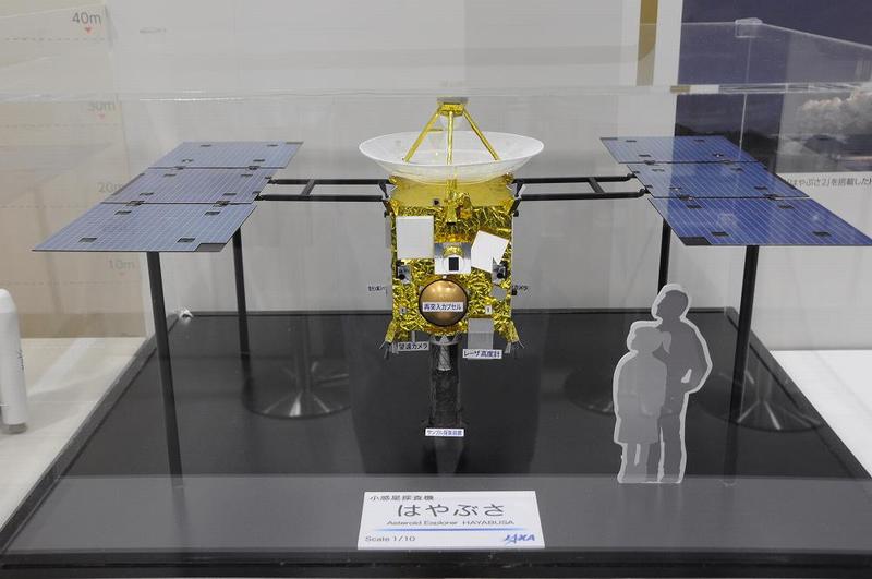 まず最初に、下の1枚目の写真は「はやぶさ」の模型、サンプル収集装置に直結した「再突入カプセル」の表面は金ぴか(地球帰還時には底蓋)である。