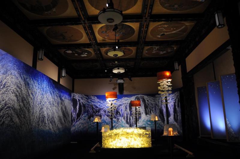 百段階段の一番目の部屋「十畝の間」には、間島秀徳氏の日本画と、折花作家・三谷基氏の折花(おりはな)が展示されている。