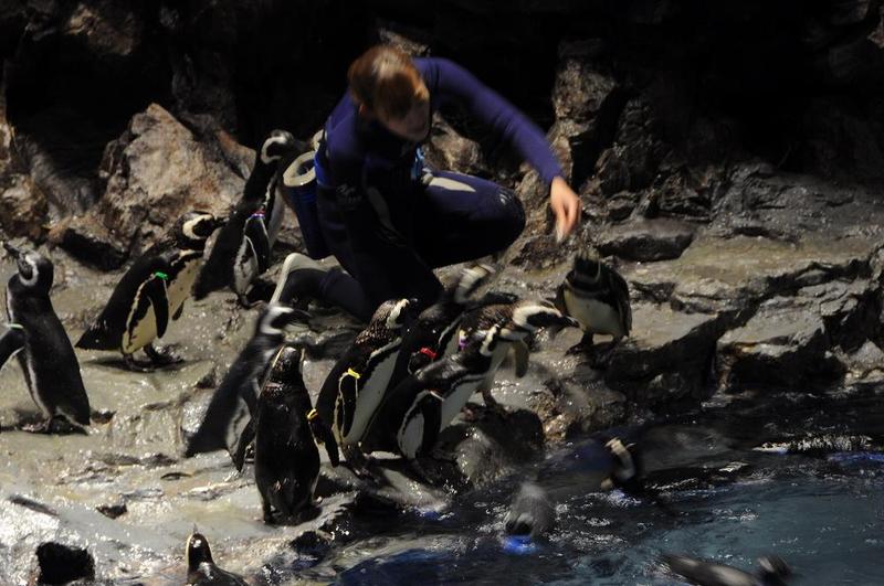 昨年も撮影しているのだが、カメラを構えた場所は異なる。飼育員たちはペンギン達を、3グループ分けをして、アジとイワシを与えているが、必ず、餌を幾つあげたのか報告している。