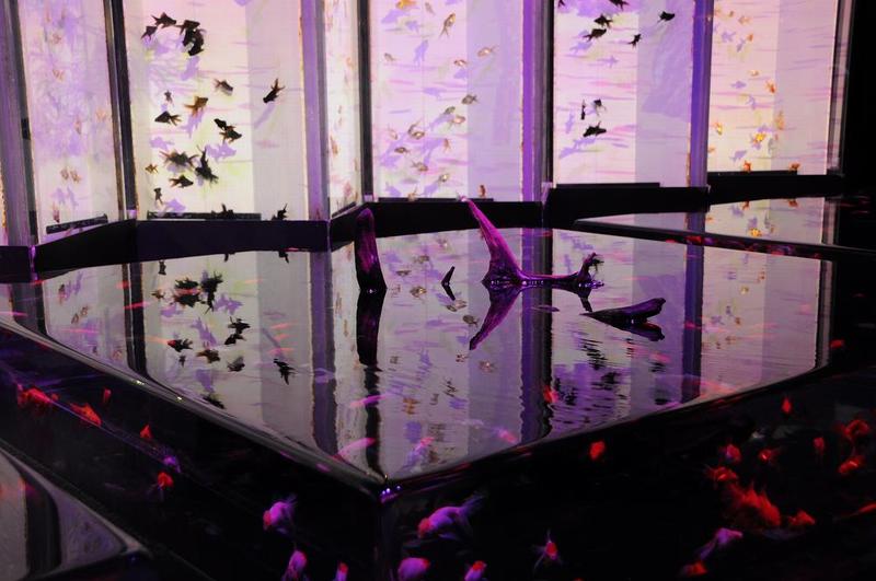 18面の水槽に、芸術の世界にも大きな影響を与えた大政奉還の時期と、その前後の、3つの時代を表現したプロジェクションマッピングを用いて日本美術史の移り変わりを表した映像を投影していた。