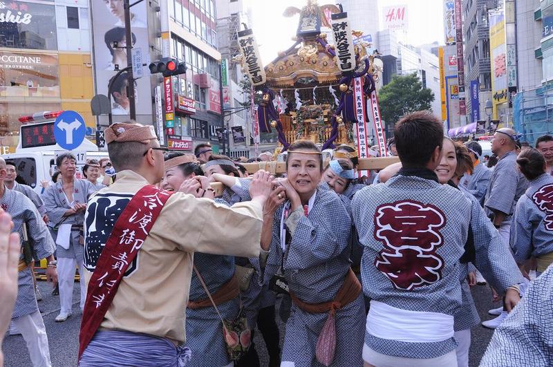 | 渋谷駅周辺の各町会から集まった14基の神輿の連合渡御は「道玄坂」を交通止めにした歩行者天国だからこそ出来るものの、渋谷駅前の「スクランブル交差点」は車の交通量も多く、横断する人の波も多いのだ。 「渋谷三丁目の神輿」が地元に帰還するには、「スクランブル交差点」を通過しなければならない。
