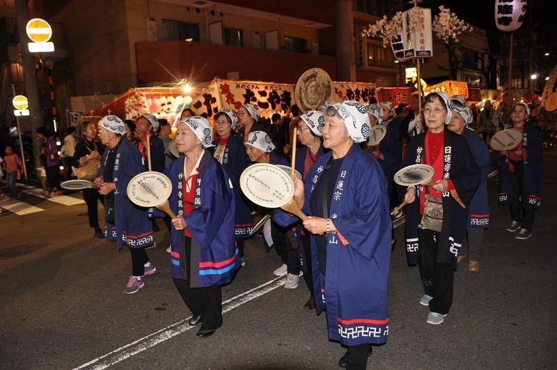 命日・前日の12日の18時から深夜まで、東急池上駅前から境内までの2キロメートルの参道は3000人の日蓮宗の信者が打ち鳴らす「団扇太鼓」と万灯(まんとう)や纏(まとい)を振り回し、見物客は30万人以上のお祭りです。
