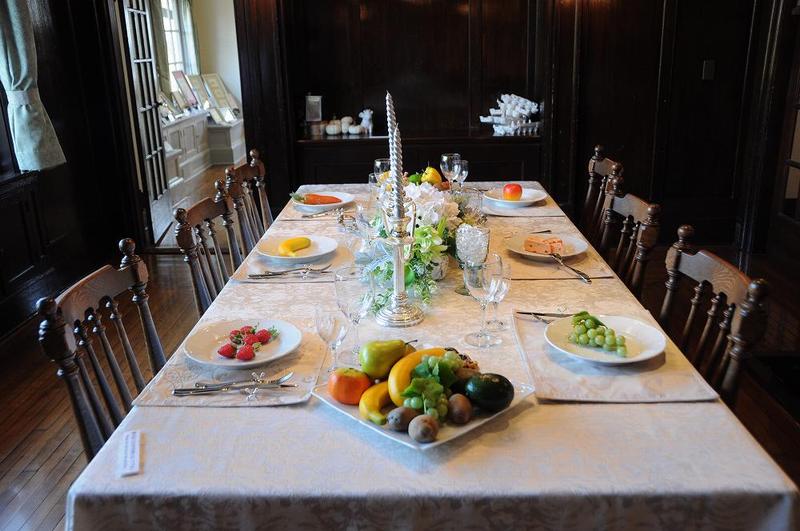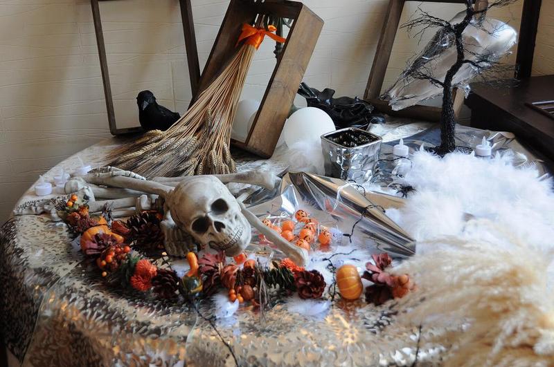 玄関を入ると、雪景色が広がり雪女が出迎えてくれる。 振り返り、テーブルの上を見ると、人骨とシャレコウベが・・・・ドキッとする光景である。 窓際には複数のコウモリが飛び交っている。 ・・・外国ではコウモリがオバケの使いなのか?