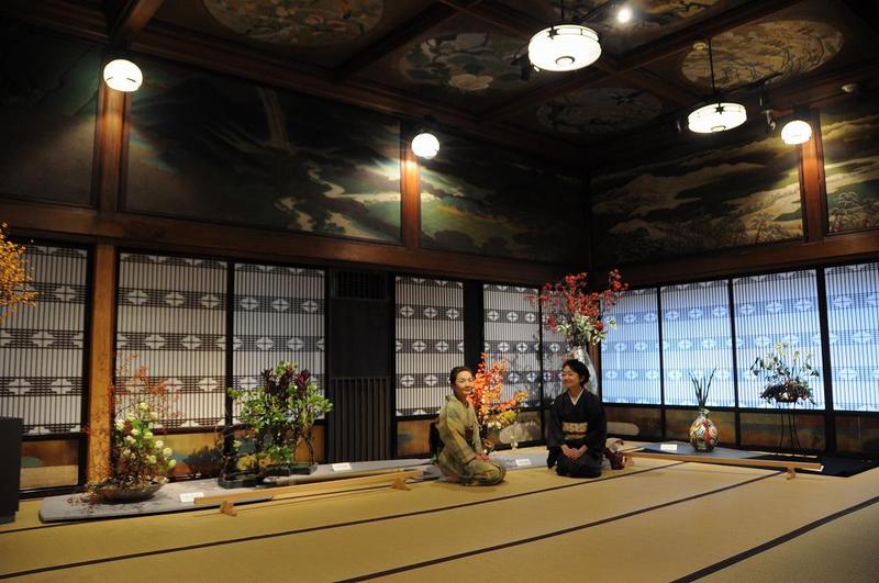 鑑賞者の中に和服姿の人を見つけても、立ち姿では、絵にならない。 やはり、正座姿でお願いしたいもの。「星光の間」には、「華道高野山」が出展している。