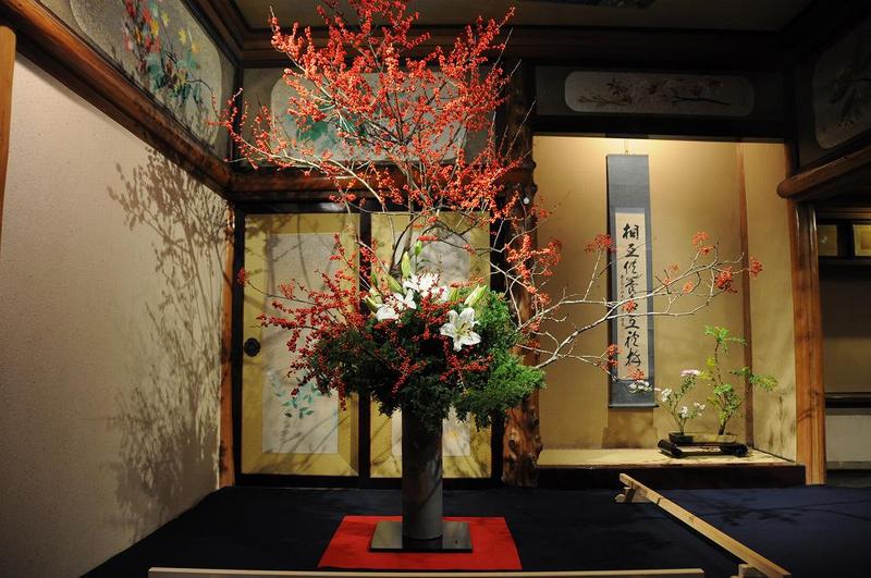 お寺の現役お坊さんが生ける今年の作品は、「不動明王をイメージ」したもの、カサブランカはお不動さま、赤い実を付けた物は火焔光背を表現しているとか。