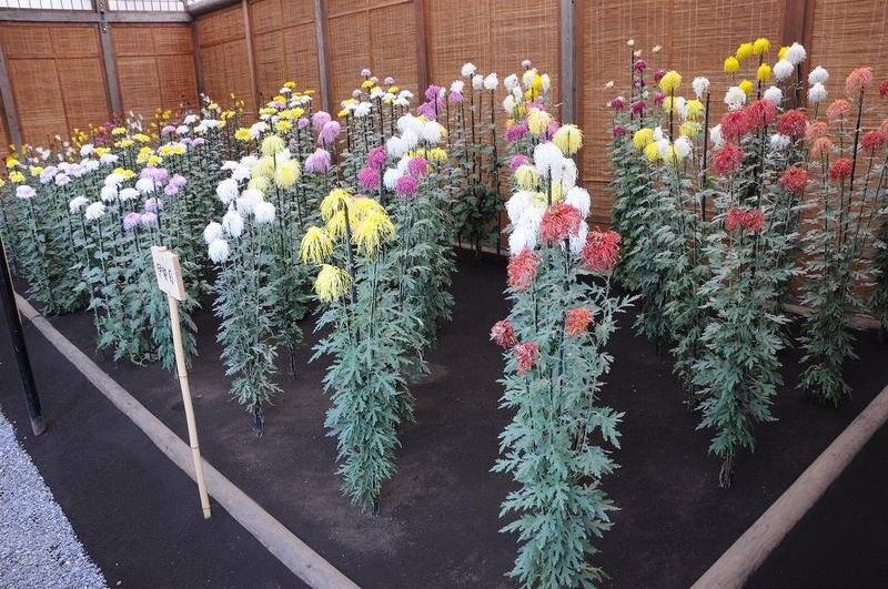 花壇には、伊勢菊32株、丁子菊32株、嵯峨菊25株の順に配色よく植えつけられている。 ・・・ と、ネット上で記載して有るものが有ったが、一見すると判らないが、根元で束ねてしまっているのだろうか?