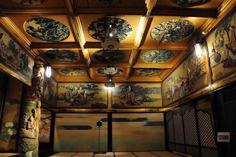 格天井には「菊池華秋」原図による四季草花、欄間は尾竹竹坡原図の藤原時代上流風俗を