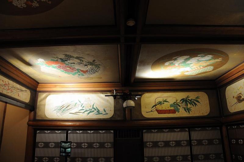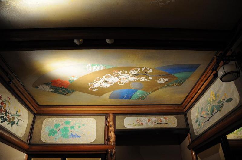 天井には籠に盛った花の絵も有り、親しみの有る部屋となっている。入口に近い「次の間」の天井の絵は、扇面をした図柄を取り、「奥の間」の天井の絵は円形の図柄で有る。