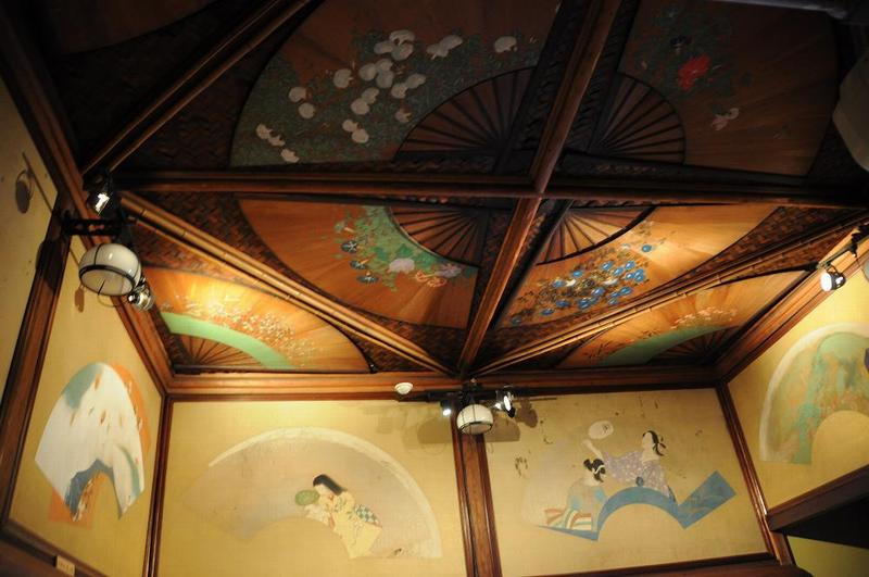 天井には、扇面形杉柾板を使用し、四季草花を描き、欄間には四季風俗美人画を描いている。