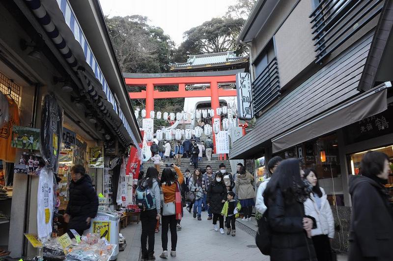下之宮(現・辺津宮)は、将軍源実朝により創建された。江戸時代になると、干潮になると砂浜で江の島は陸と繋がり、江戸からの詣で客が押し寄せた。