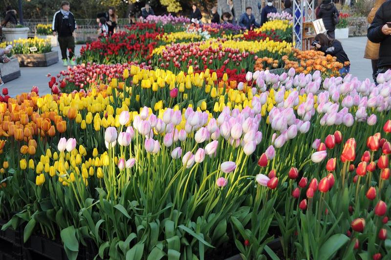 2万株のチューリップは大地への直植えではなく、木製の箱に植えられている。 |