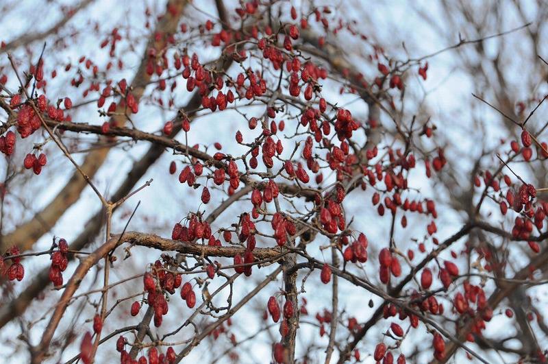 花はかわいい黄色の花で、グミのような赤い実を付けてはいるが、今回のように、干からびた実が鈴なりになった木を初めて見た。
