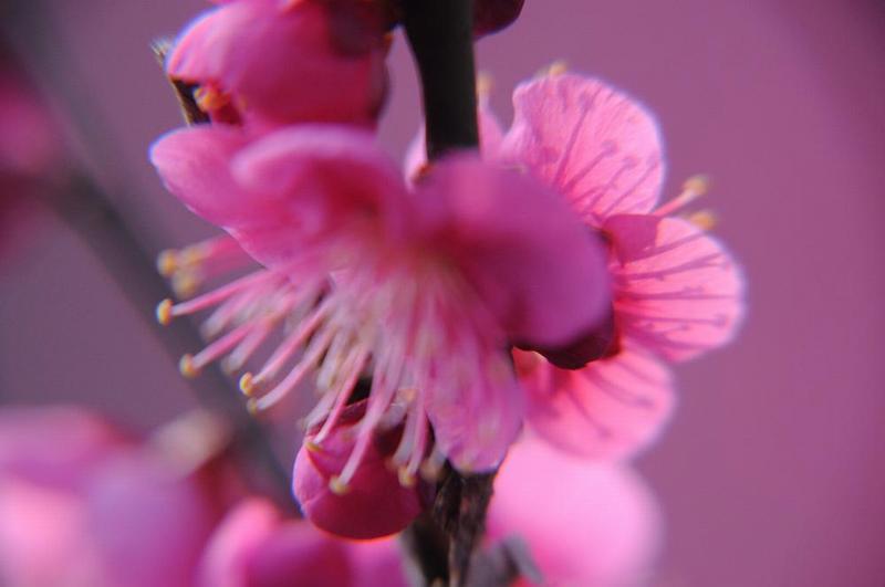 下の2枚目の写真は、後ろ側に咲いている花にピントを合わせ、「メシベ・オシベ」の『花糸』がピンクの花びら『花弁』に影絵になった瞬間を撮影しています。 |