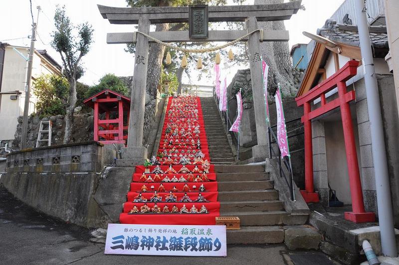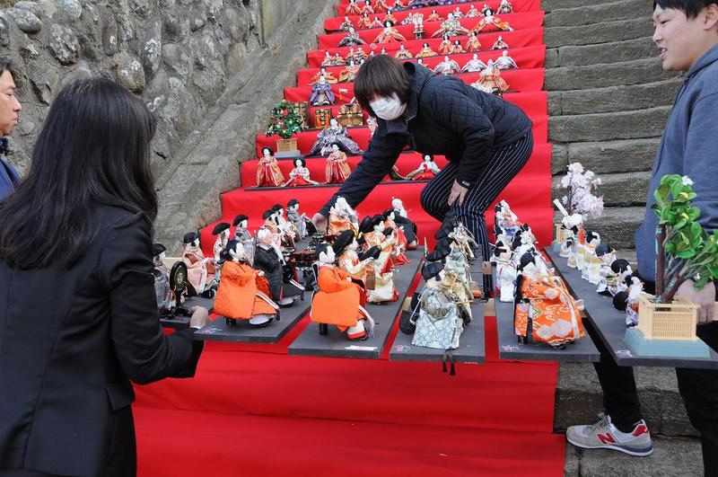 その間に、伊豆稲取でも「神社の石段を活用した段飾り」が始まっており、初の取材で有る。展示時間は、晴れた日の「10:30〜15:00」と制限付きで有る。