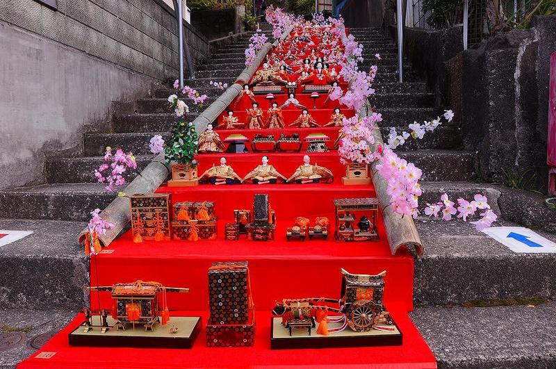 一方、隣接する東伊豆町稲取地区では2014年に「雛のつるし飾りまつり」の一環として、素戔嗚神社の階段を利用して48段の雛壇飾りを設置。
