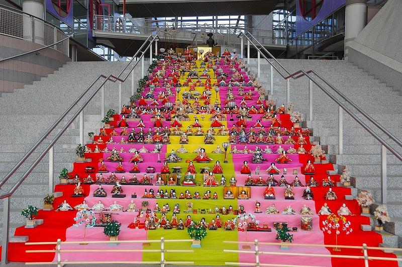 「伊東MAGARI雛」のメイン会場の1つ、「伊東市役所1階ロビー」には、27段の階段を雛壇として、遠近法で見ると、「八の字」になるため、『末広の雛』とサブタイトルを付けた。