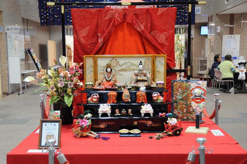 展示会場のロビー中央には、玄関入口から見える正面に、内裏雛とお雛さまを段飾りとして来訪者を迎え入れている。