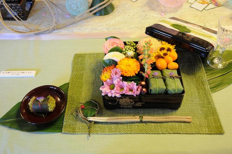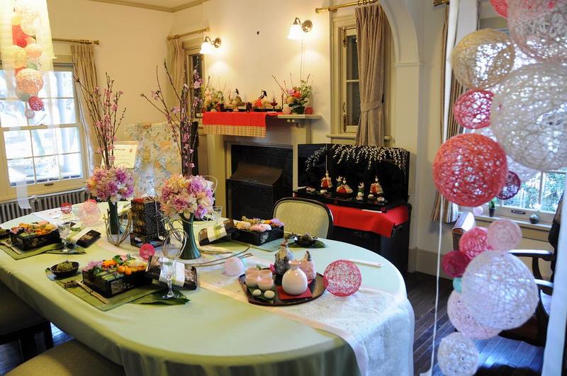「やよい はずむ」と言われるように、桃の花や淡い色のボール形の吊り飾りが会場内を彩っている。 テーブルの上に置かれた重箱の中身は、生花も使われており、見た目も美味しそうな飾り物。 お雛さまとして使用されているのは、かわいい真多呂人形だ。