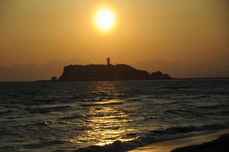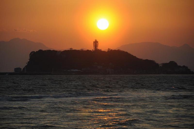 日没の太陽に飲み込まれる江の島の灯台の撮影には、間に合わなかった。