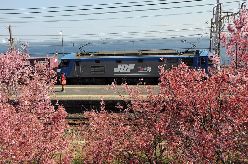 いままでは、根府川駅の南斜面にあった「花の咲かない桜の木」がツタが絡み写真映えしなかったが、2018年に伐採されて「おかめ桜とJR車輌のコラボ」が可能になった。