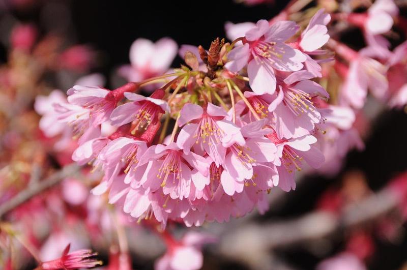 | 神奈川県の西部と伊豆半島の北部の「早咲き桜」は、12月末の「熱海桜」の開花から始まり、2月には、伊豆西海岸の「土肥桜」、伊豆東海岸の「河津桜」、3月には、根府川の「おかめ桜」、南足柄の「春めき桜」と続き、彼岸過ぎには、「ソメイヨシの開花」となる。 「おかめ桜」が脚光を浴びるようになったのは、小田原市根府川の山間部にシイタケ農園を営んでいる畑に早咲きの桜を植えた事から始まり、その後、「離れのやど星ヶ山」でも植樹、さらに、JR根府川駅や道路の街路樹としても植樹され、現在では、約400本が濃いピンクの花を咲かせています。