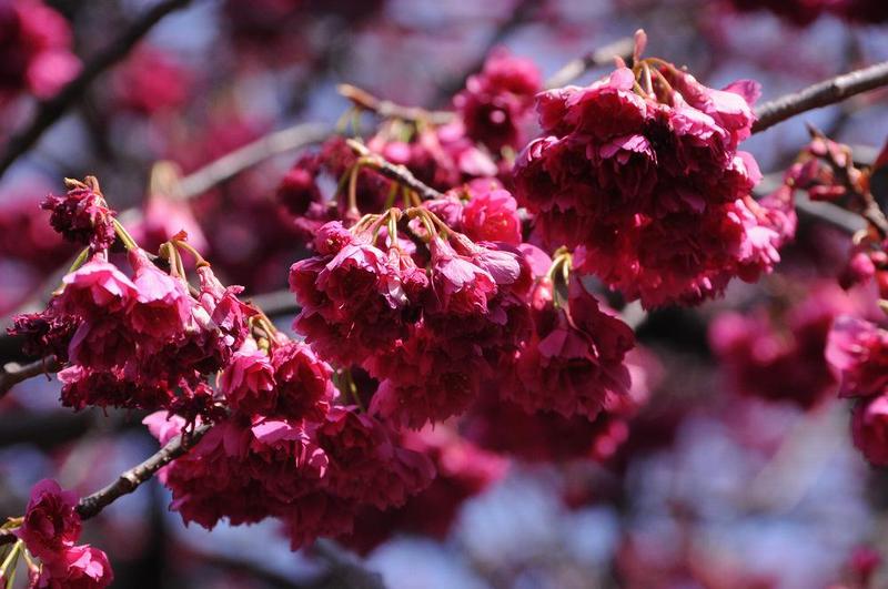 「緋寒桜」は赤黒い花びらで塊を作って咲くのが特徴ある。