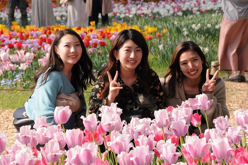人出の多い事は、毎年経験しており、人間を含めてチューリップのデザイン性をいかに画角に取り込むかが、カメラマンの腕のみせどころである。とあるビューポイントでカメラを構えてファインダーを覗いていると、7メートル前方で、三人連れの1人にXサインをしながら、ニコッとされた。