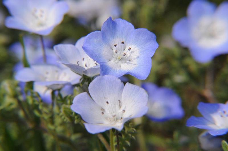 | 関東で『ネモフィラ』を取材するとなると代表的な場所は、「国営ひたち海浜公園」,「国営昭和記念公園」,「くりはま花の国」,「国営武蔵丘陵森林公園」,「富田さとにわ耕園」だとか、自宅から一番近いのが「国営昭和記念公園」だが、「ひたち海浜公園」のように、「花・海・空」をブルー一色で染めるような写真は撮れない。 小さな「ネモフィラの花畑」でも、4万株を植えているらしいが、10〜20メートル前方にはカメラマンの足が写り込む。
