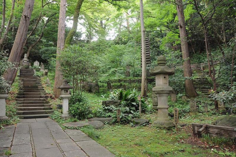 武蔵野の雑木林が多摩川に向って深く傾斜する庭園には、「大日如来」や「六地蔵」など伊豆や長野の鉄道事業の際に引き取った石仏が点在している。