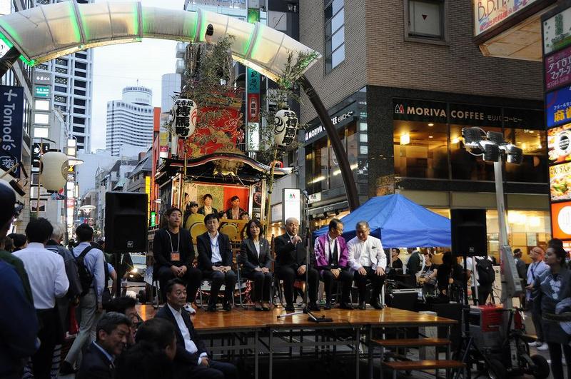 都心のオフィスビルを背景に、街灯りにライトアップされた江戸絵巻が壮麗に浮かんだ。